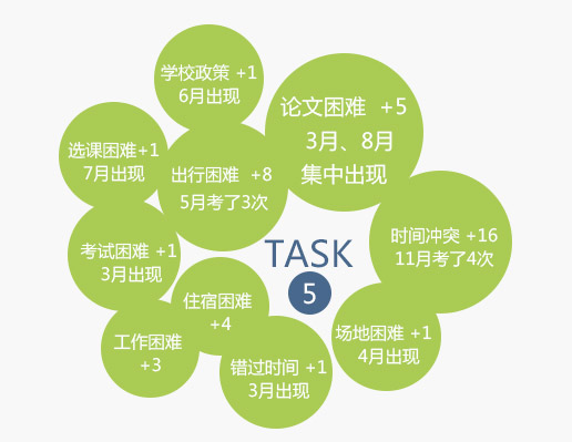 2016年出题类型较多,频率较高的前三名为时间冲突话题,考了16次;论文困难话题出现5次,出行困难话题出现了8次。